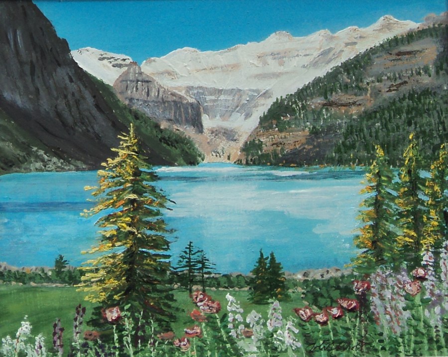 Lake Louise in Summer, Acrylic, 9.5×7.5 inches $250